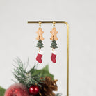 Colors: Latte Brown Gingerbread Men, Green Trees, Red Stockings