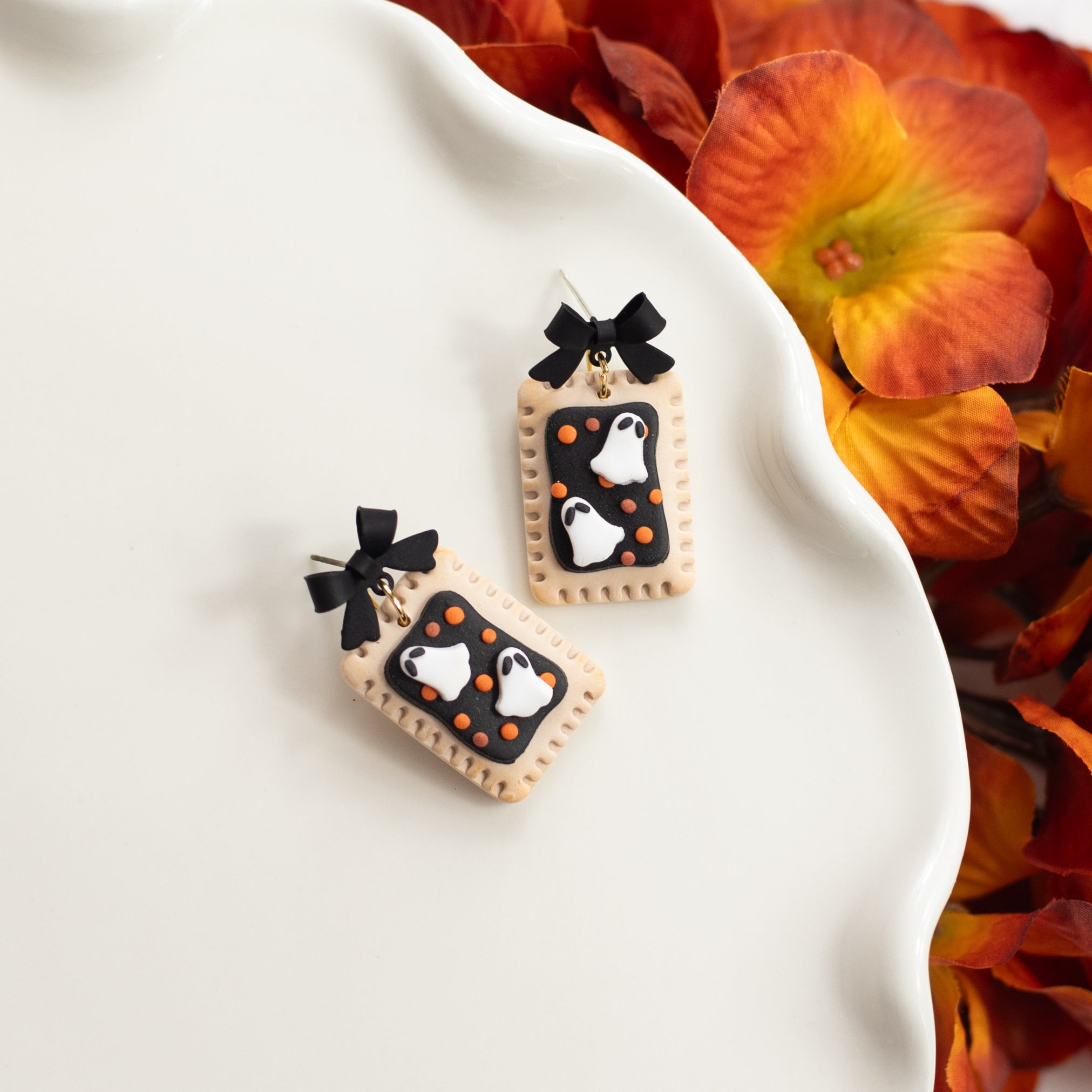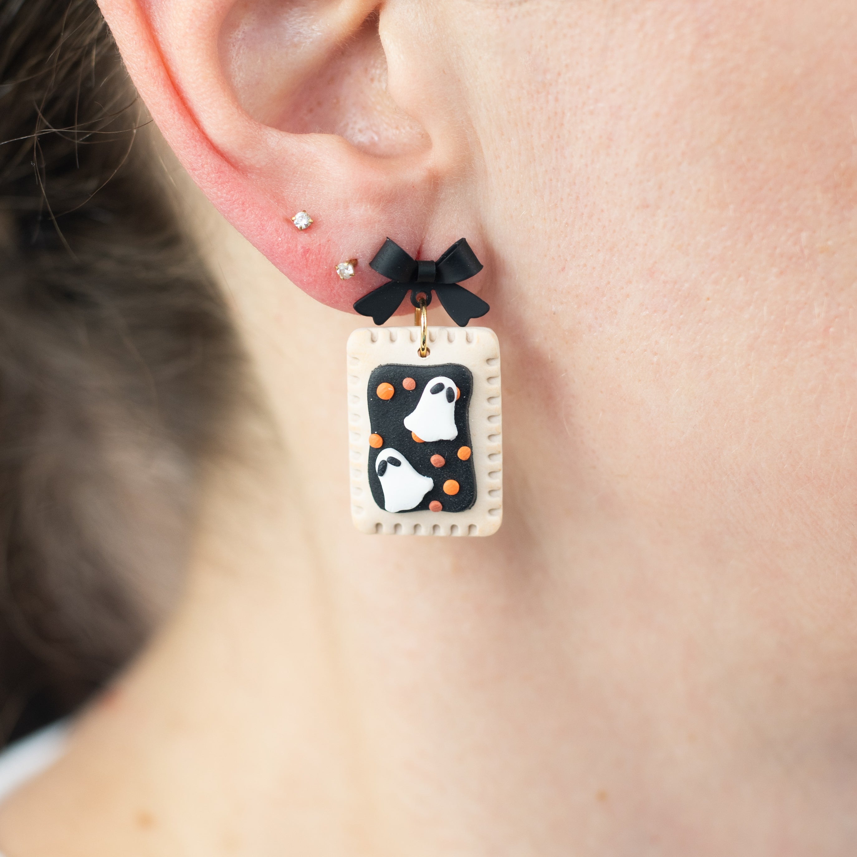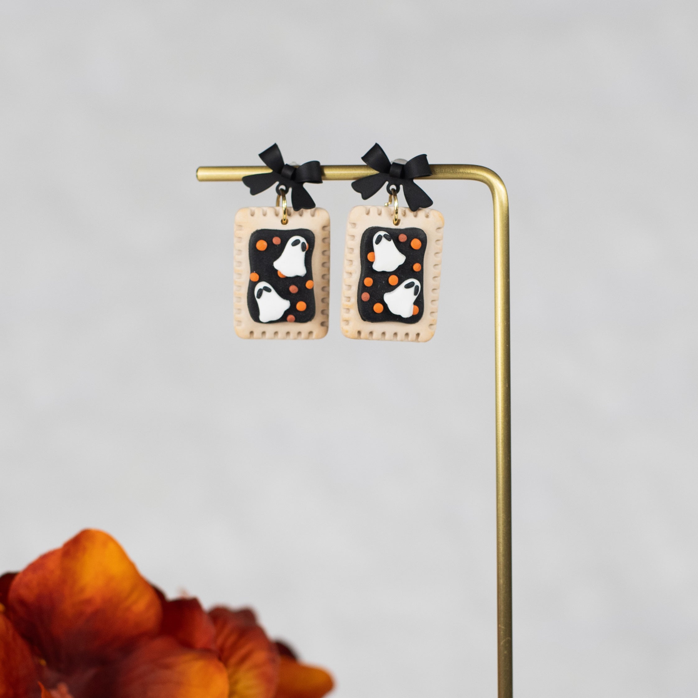 Add a touch of Spooky-cute with these spooky pop-tart dangles with little white ghosts attached to tiny black bow posts