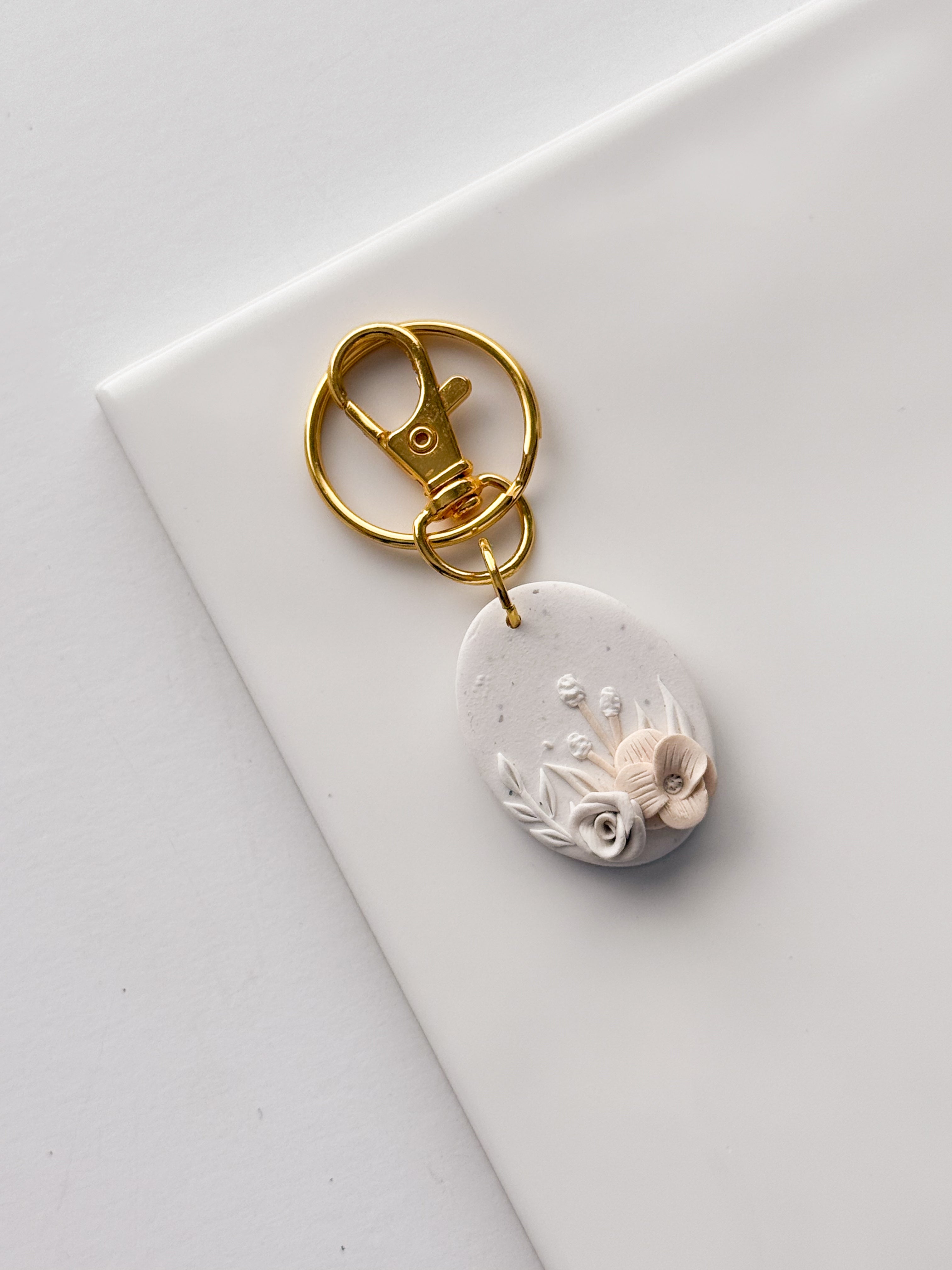 Elegant White Floral Oval Keychain