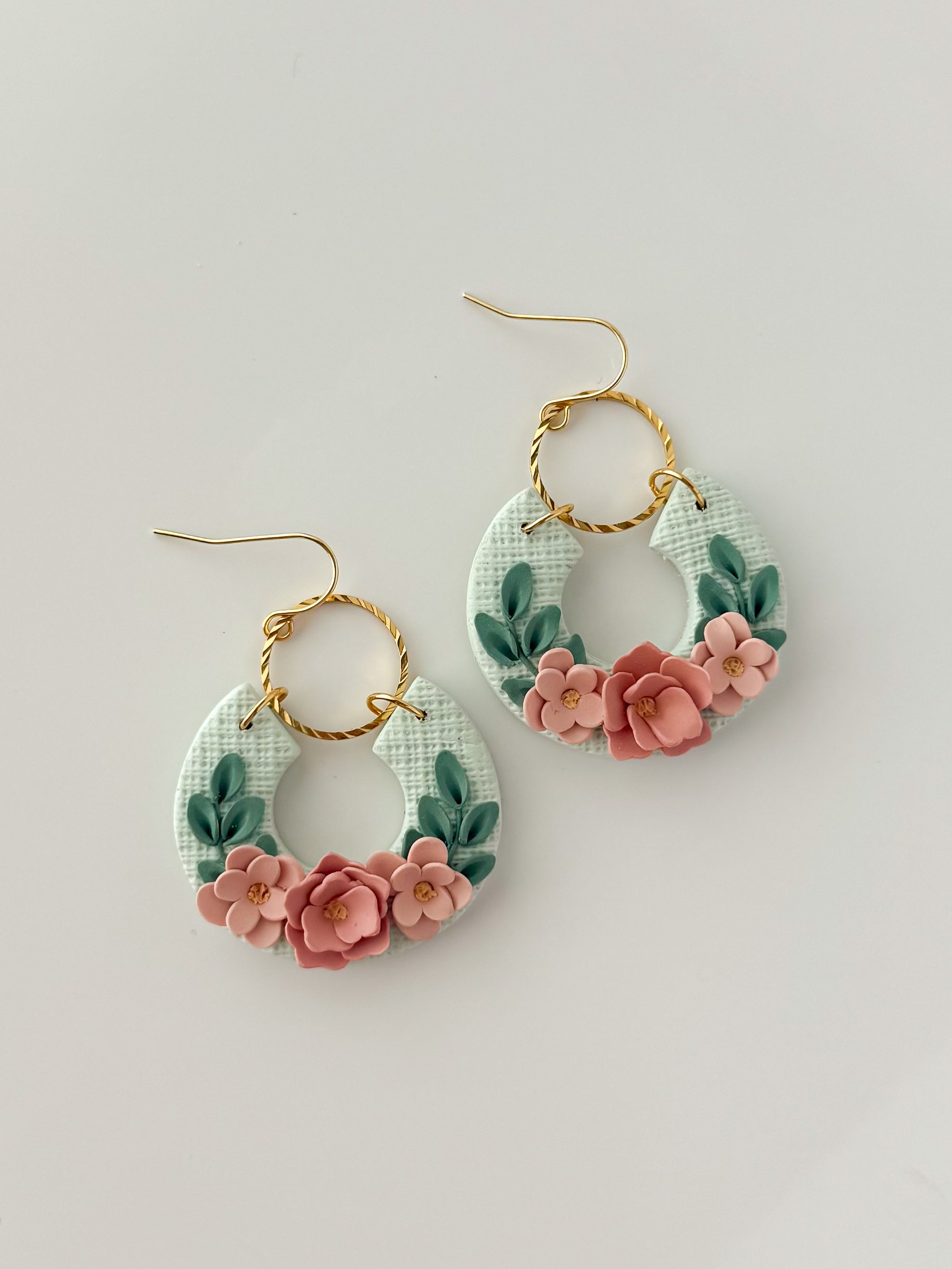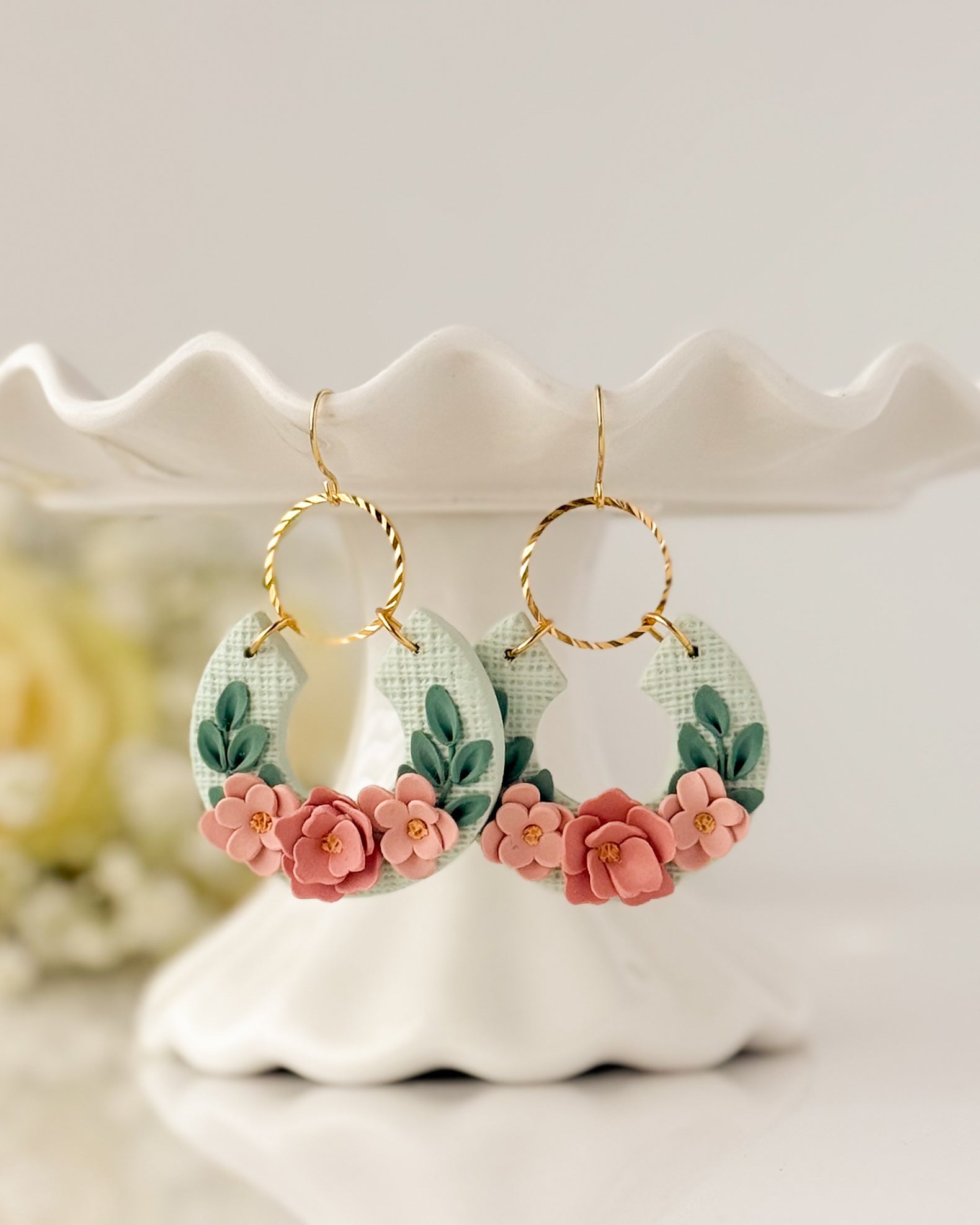 Featuring a soft sage green base with linen-like texture, hand-sculpted coral and blush flowers, and leafy accents, they’re finished with twisted gold hoops for the perfect polished touch