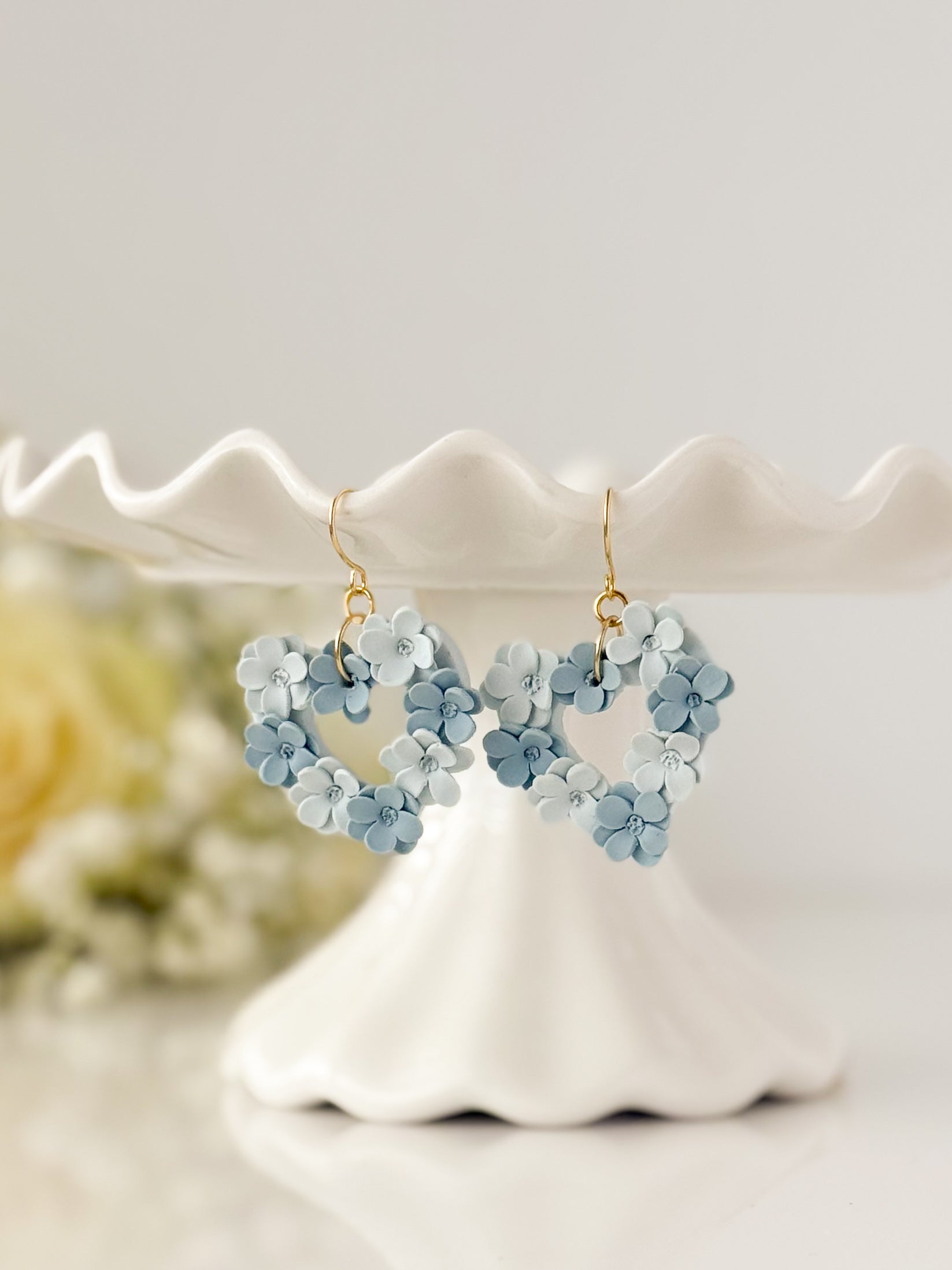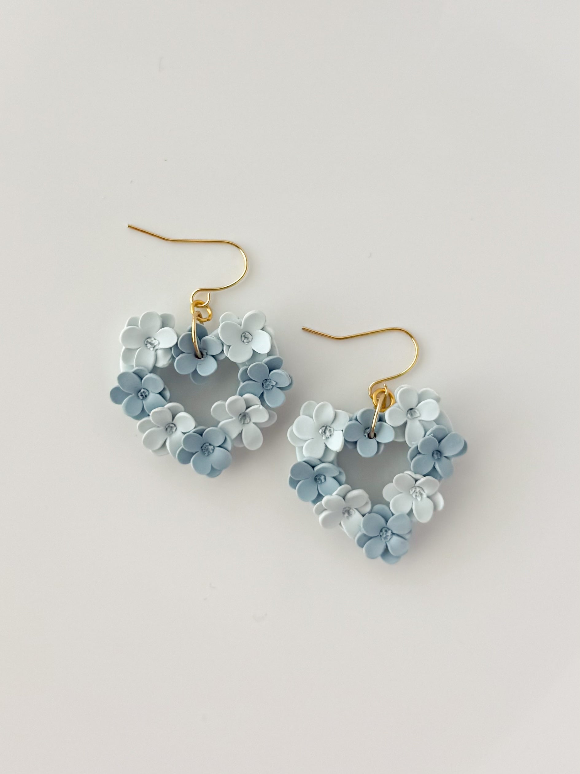 Sweet, delicate, and full of love—these heart-shaped earrings are wrapped in soft blue floral blooms