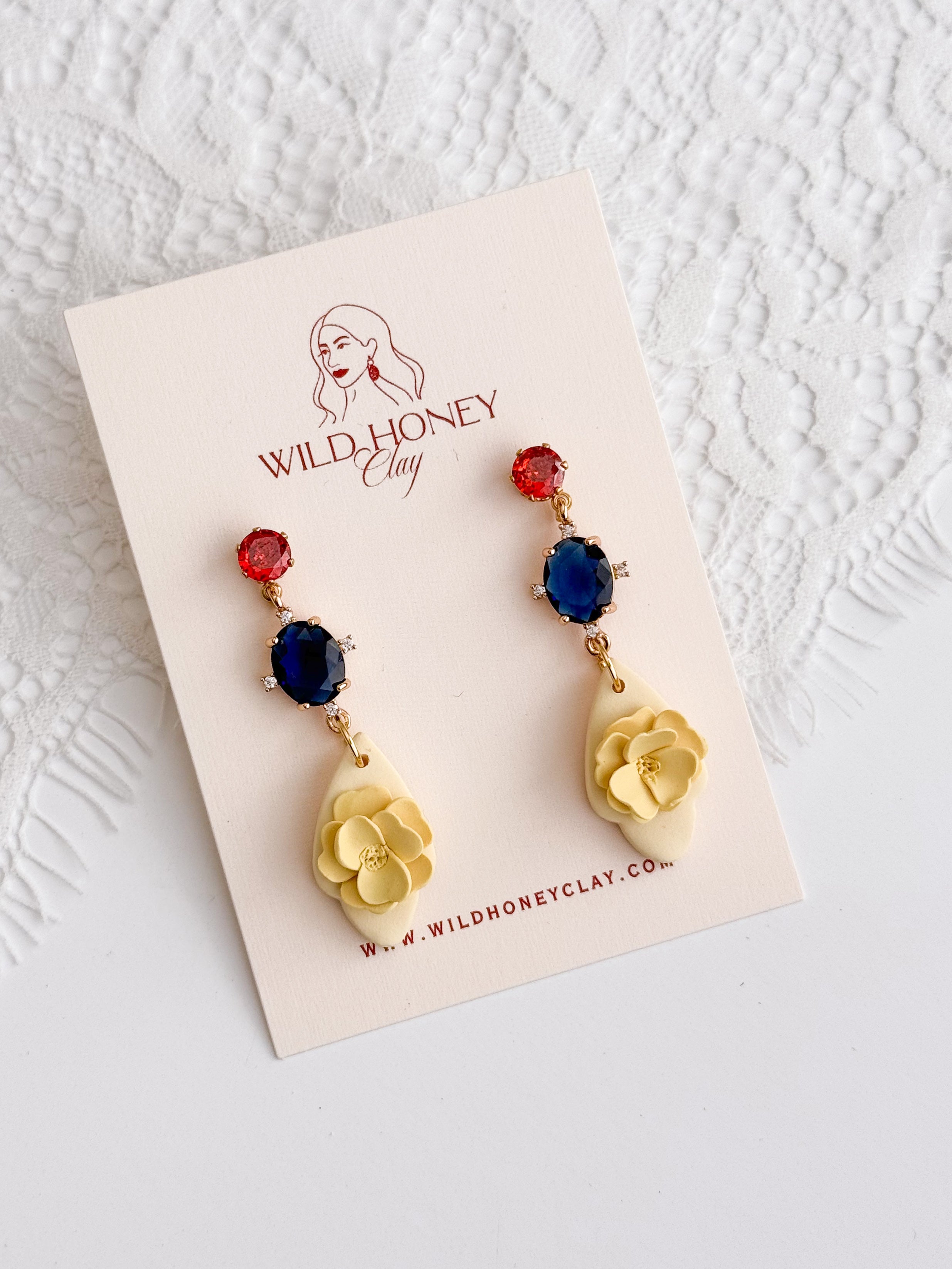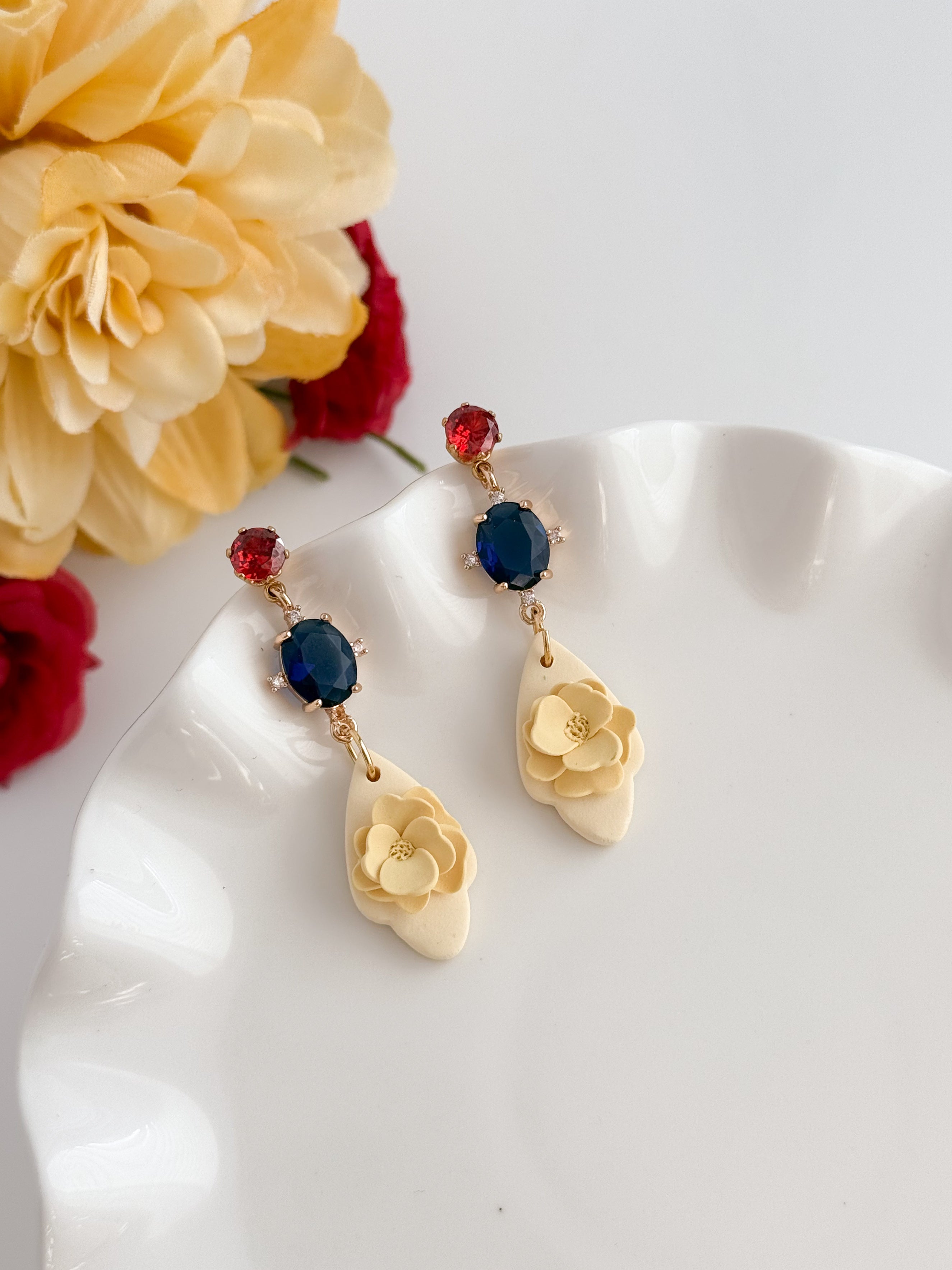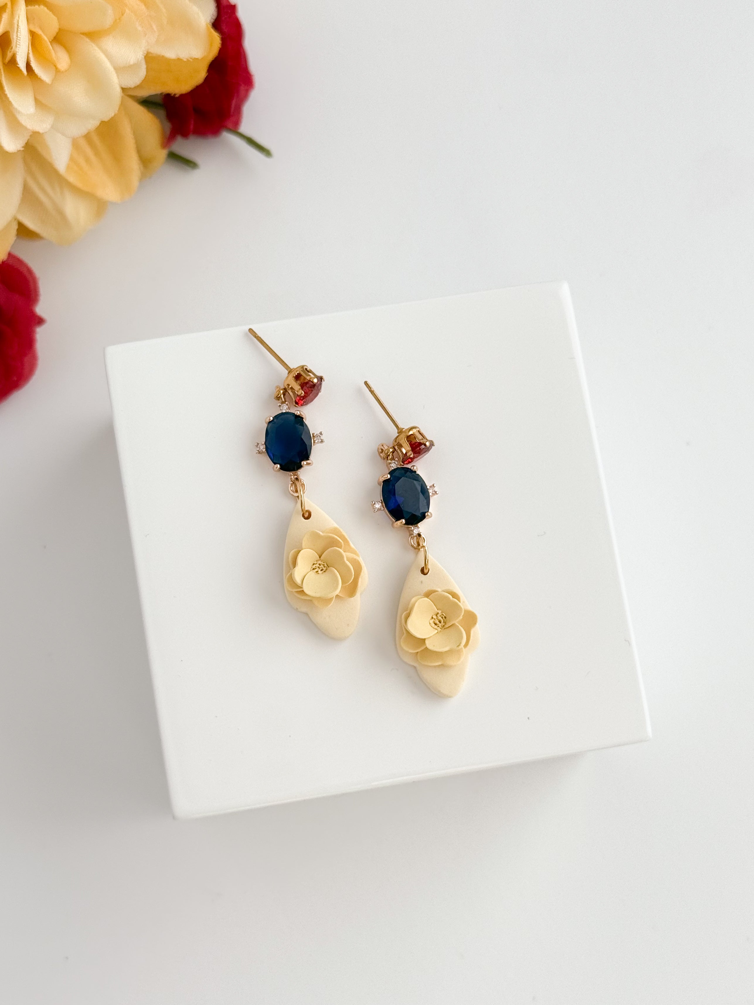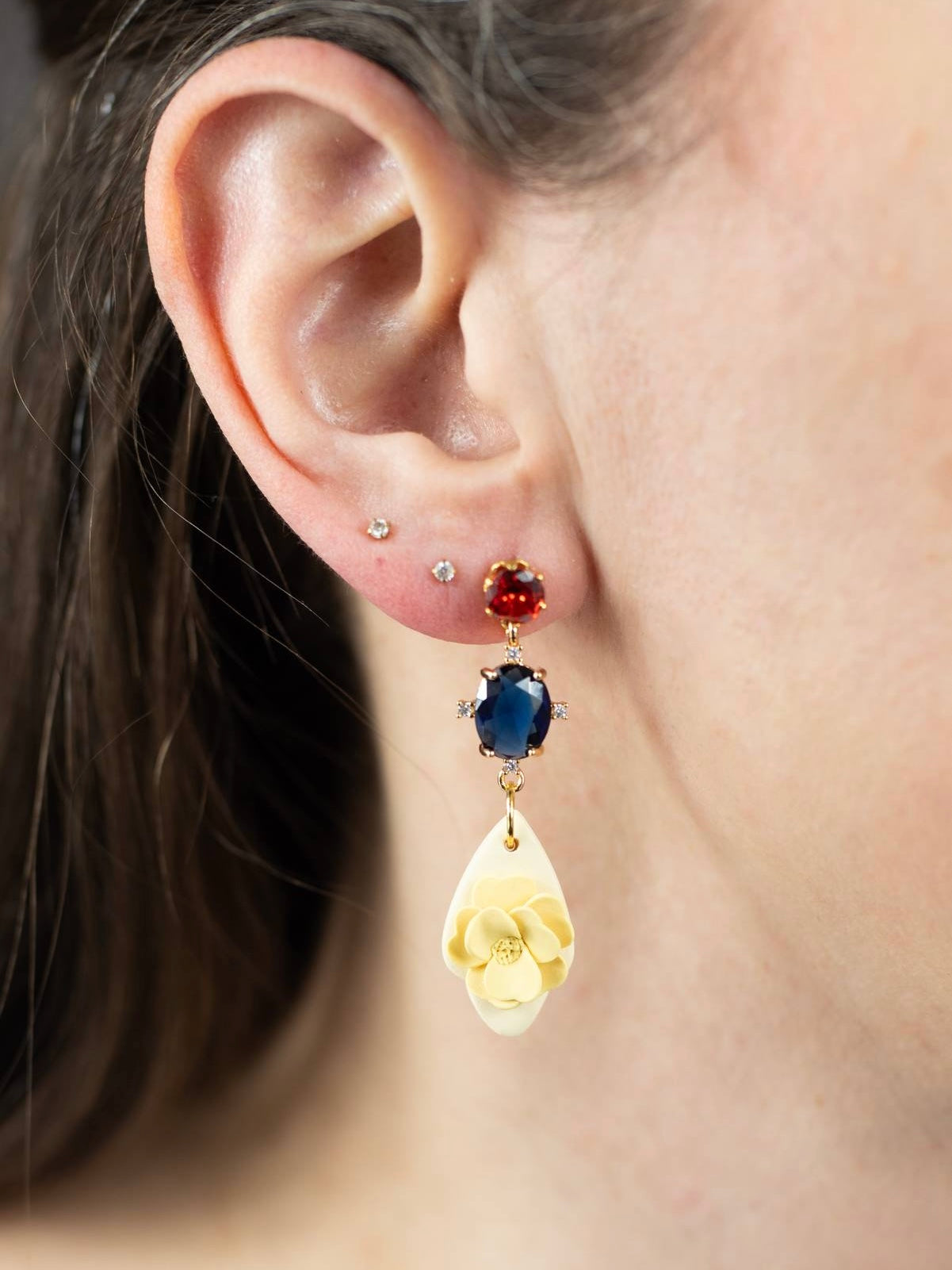 Colors: Soft Yellow Bottom Piece with Yellow Florals attached to a vintage blue charm and red zircon diamond posts